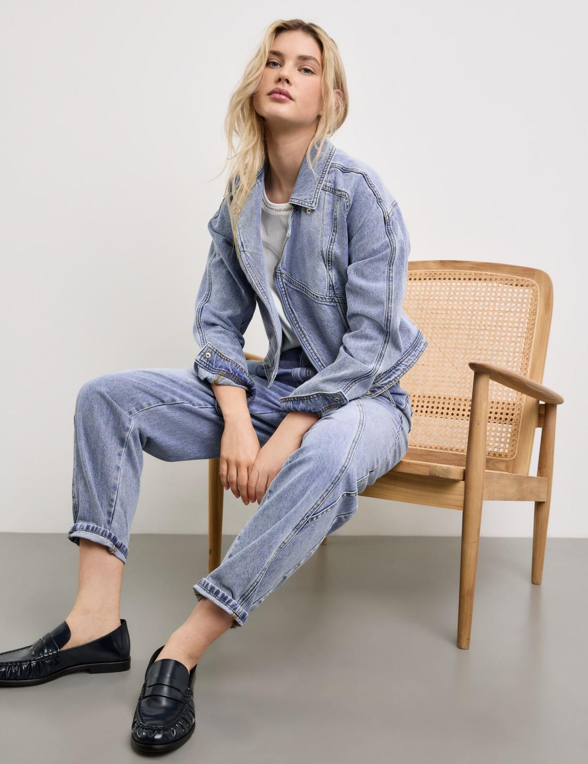 Verleihe deinem Style eine Extraportion Coolness mit unserer Jeansjacke im Biker-Look! Die sportiven Details und der lässige Schnitt machen sie zum Highlight deiner Garderobe. Style sie mit einem lässigen Shirt und und Balloon Jeans für den ultimativen Street-Chic oder wirf sie über ein fließendes Kleid und verleihe dem Look eine faszinierende Dynamik.