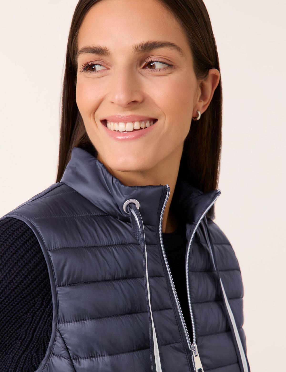 Diese modische Steppweste lässt sich vielseitig kombinieren und jahreszeitenübergreifend tragen. Die Absteppung und die farblich abgesetzten Ripsbänder mit Lurex sind modische Gestaltungsdetails, die Ihrem Outfit das gewisse Etwas verleihen. Tragen Sie die Weste solo über einen Pullover oder stylisch im Layering-Look, so gelingt mühelos ein Look, der sich auch der Wetterlage anpassen lässt.