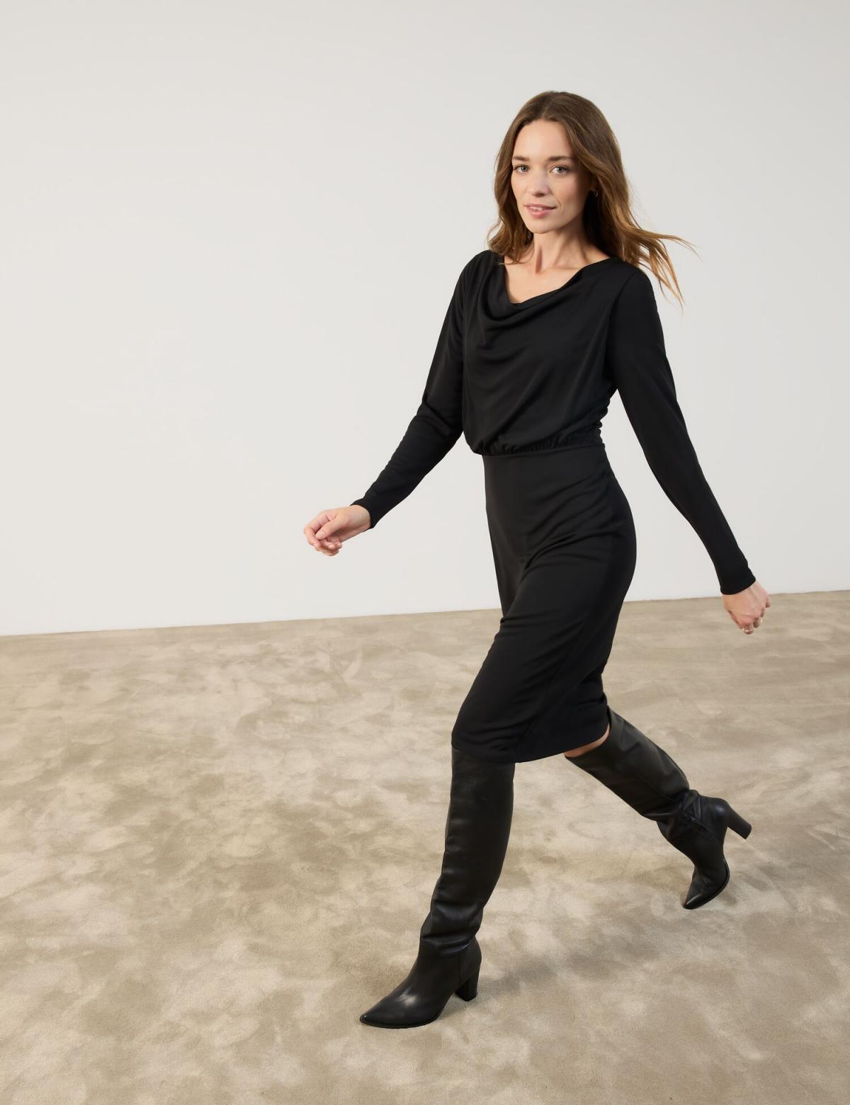 Dein neuer Look für besondere Momente! Mit seinem locker geschnittenen Oberteil und einem schmalen Rockteil zaubert dieses Kleid eine schmeichelhafte Silhouette. Die kniebedeckende Länge unterstreicht die elegante Optik, während der hochwertige Interlockjersey für einen festen Griff und ein formschönes Finish sorgt. Ein femininer Allrounder, der dich von Tag zu Nacht begleitet!