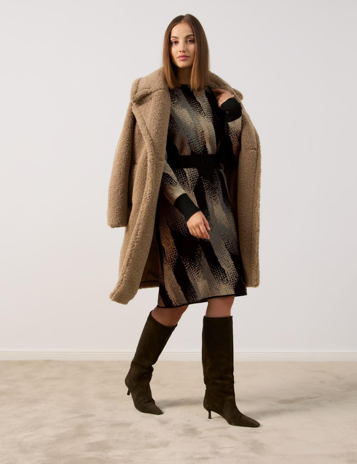 Chic und vielseitig: Dieses Strickkleid ist der ideale Begleiter für die kühlere Jahreszeit! Der kuschelige Strick hält dich angenehm warm, während das ausgefallene Jacquardmuster alle Blicke auf sich zieht. Mit dem Taillengürtel kannst du deine Figur betonen und deinem Look eine feminine Note verleihen. Kombiniere es mit deinen Lieblingsboots – fertig!