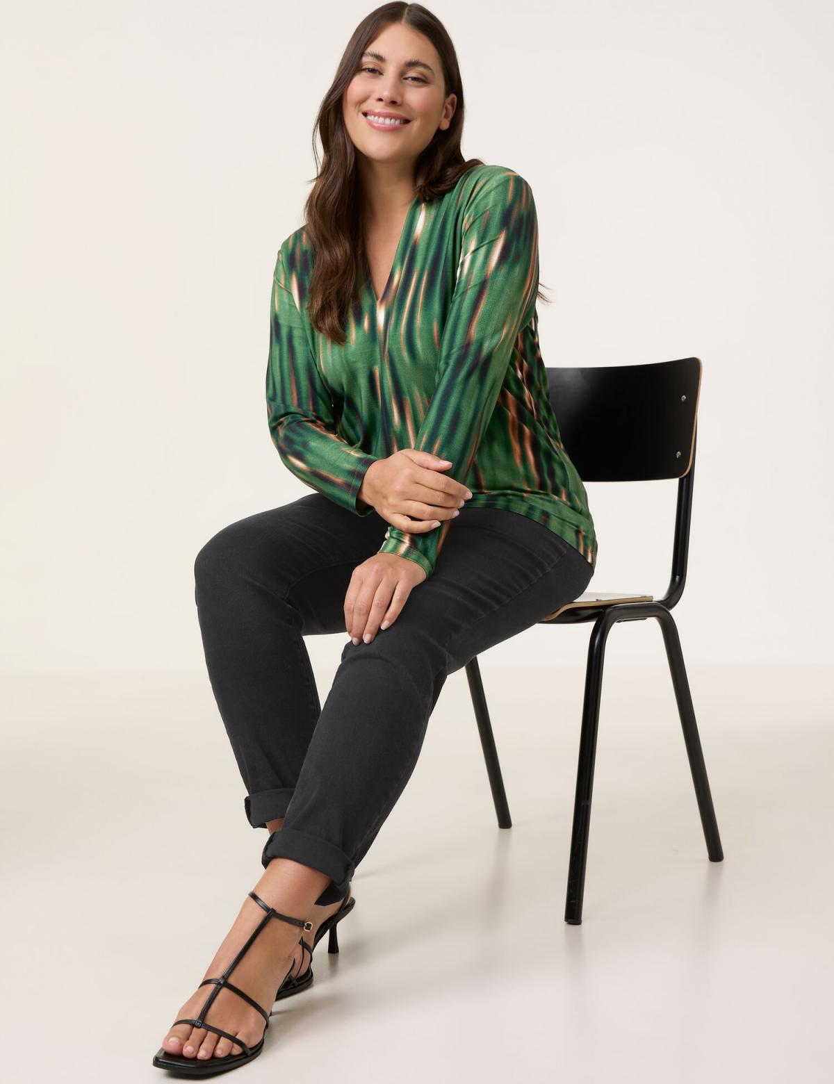 Eleganter Allrounder! Dieses Langarmshirt überzeugt durch seinen schmeichelhaften Schnitt und das moderne Design. Der ausgefallene Allover-Print streckt optisch die Silhouette, während der Kelchkragen mit V-Ausschnitt für eine feminine Ausstrahlung sorgt. Ein modernes Essential, das Stil und Komfort perfekt kombiniert.